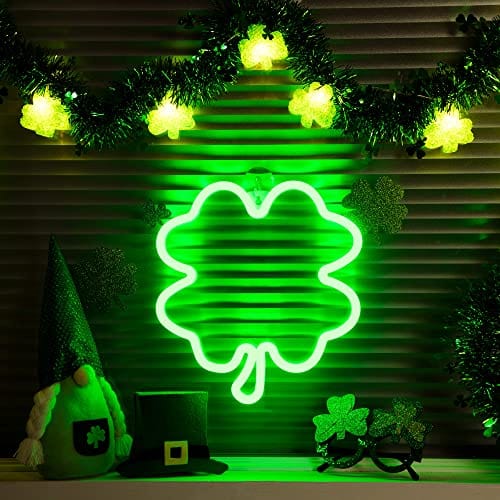 Details: 11.5 Inch St. Patrick Day Decoration lights Created a peaceful atmosphere in St Patrick's Day Product Highlights Four leaf clover neon lights made from silicon strips, safety and low power consumption St. Patrick's Day window light will light up your window in this ancient festival Suction cup help you install the clover lighted window decoration everywhere anytime Package include: 2 x Clover window lights 2 x Suction cup Note: Do not bend the hanging lights, to prevent chipping Manual measurement, please allow slight difference on size Before use, make sure the installation location is clean