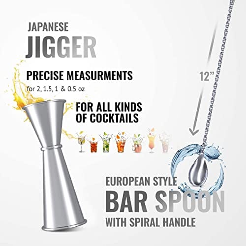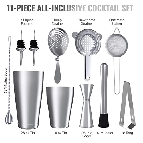 - 11-PIECE ALL-INCLUSIVE COCKTAIL SET: Whether you're a beginner or are a pro at bartending, we got your back! Our Boston Shaker Set consists of 18 & 28 oz shakers; three types of strainers: Julep, Hawthorne & Fine Mesh strainers for making different types of cocktails; Japanese Jigger with precise measurements for 1.5, 1 & 0.5 oz; European style Bar Spoon with spiral handle to help you stir your drinks with ease; Two liquid pourers; Ice Muddler & tongs & A Recipe Guide for 30 classic cocktails.
