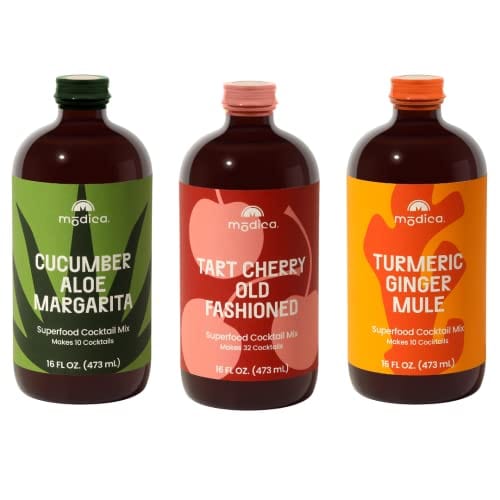Details: Enjoy a full-size bottle of each Modica mixer: Cucumber Aloe Margarita, Turmeric Ginger Mule, and Tart Cherry Old Fashioned.