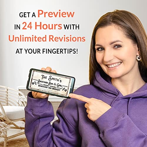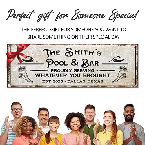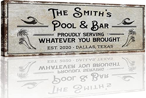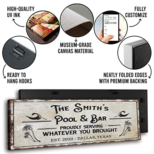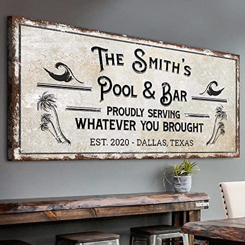TAILORED CANVASES Bar Sign Custom Decor - Pool and Bar Proudly Serving Whatever You Brought - Canvas Wall Art Printable Personalized for Man Cave, Kitchen, Pub & Diner - Rustic Dirty White, 48x16in
