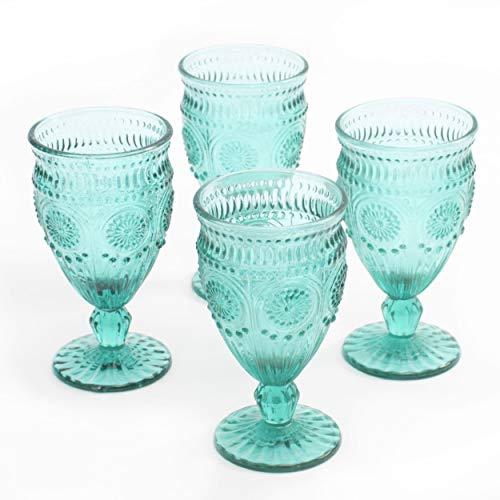 Details: Set the table for dinner with The Pioneer Woman Adeline Embossed 12-Oz Footed Glass Goblets. These water glasses are made from pressed glass and feature an embossed texture to give them an elegant look you can use for any occasion. The drinkware glass goblets come in a set of four and they will hold up to 12 oz of liquid. Use these to serve water during dinner or fill them with ice tea on a warm summer day. They come in several different colors and you can coordinate them with other pieces from the collection for a complete look.
