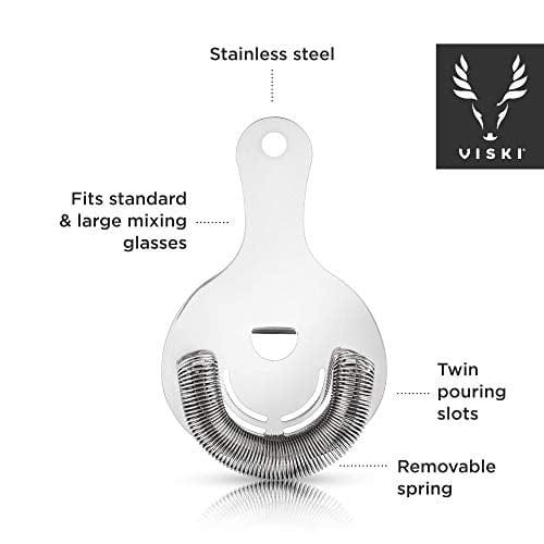 - QUALITY MATERIALS - Crafted from high quality stainless steel, our stylish strainer fits large and standard mixing glasses while two symmetrical sets of perforations make split pours second nature. Designed with a removable spring for deep cleaning.
