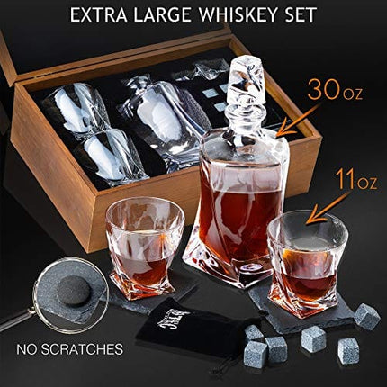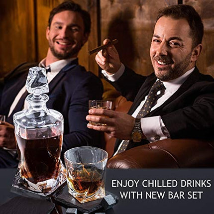 - ✔️ Luxury Whiskey Glass Gift Set – This handsome decanter set helps you enjoy whiskey, bourbon, scotch, and other fine liquors with true elegance and class with a 30 oz. crystal decanter, 2 whiskey glasses - 11 oz, 6 whiskey stones, and rustic stone coasters