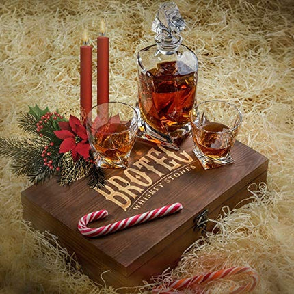 Developed by BROTEC this handsome whiskey decanter set with reusable chilling rocks, drink coasters, and stunning wood storage box is perfect for those who enjoy bourbon, scotch, and more vintage liquors.